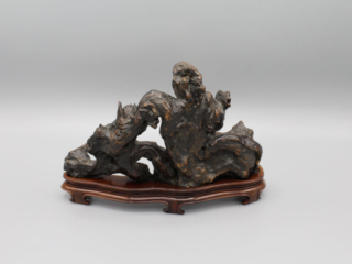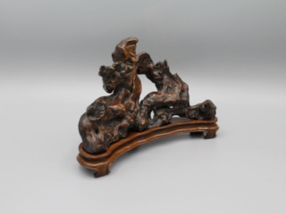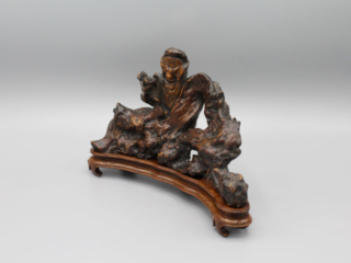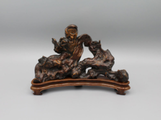 The brush rest in its natural from and stylistically carved with an immortal figure in tree root, supported by a later stand.