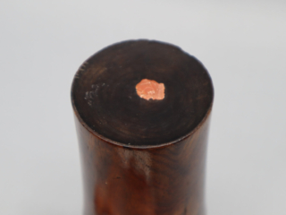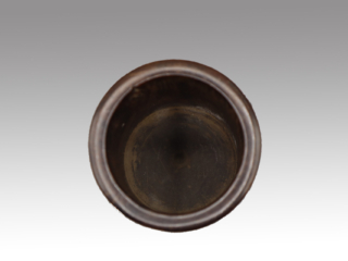 筒身收腰微張,包漿溫潤,刻畫“鬼臉”,底部微凹。