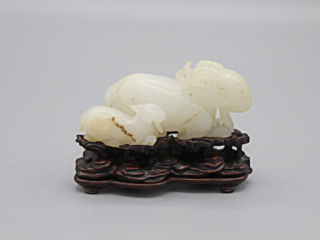 A Fine Chinese white jade carving of double rams with a later stand.