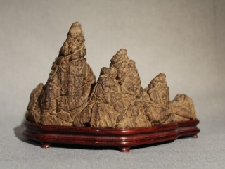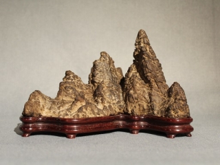 The” Ying” Mountain form scholars rock is in grey tone, formed with five peaks of varying heights dominated by a lofty peak, with dramatic creviced, sharp ridged and deeply-furrowed hollows, reminiscent of divine mountain range. The tradition of using ying stone as brush rest can be traced back to Song dynasty, when literati had an admiration for rock that imitate miniature landscape, for it echoes the spirits of mountains and rivers. It can be used as a brushrest.
