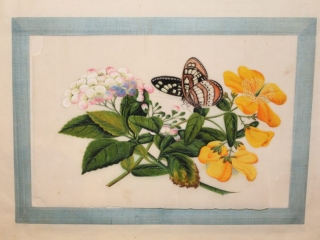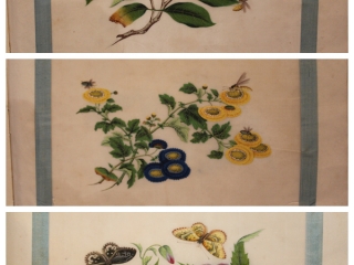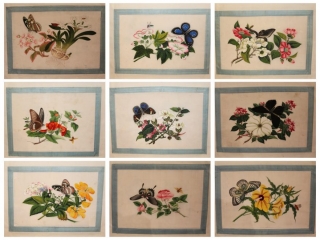 A Chinese album showing a set of 12 watercolours on rice paper, depicting different flowers and insects.